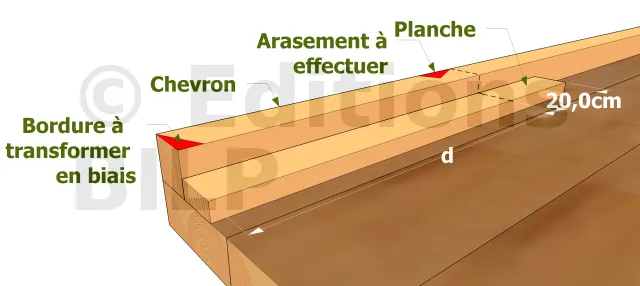 Pour éviter la difficulté d’alignement de 2 pièces de grande dimension, on va travailler une simple planche de même largeur que les chevrons. Si vous n’en avez pas à la bonne taille, découper une planche bien plane suivant sa longueur. La longueur de cette planche doit dépasser d’une vingtaine de centimètres la distance entre le bord du chevron à l’arasement à créer. Une extrémité de l’élément doit être bien droite ; si ce n’est pas le cas, tracer une ligne perpendiculaire avec une équerre de maçon et découper avec une scie égoïne ou circulaire. Attention, il y a donc 2 patrons pour les 2 extrémités d’un chevron et ils ne sont pas identiques.
