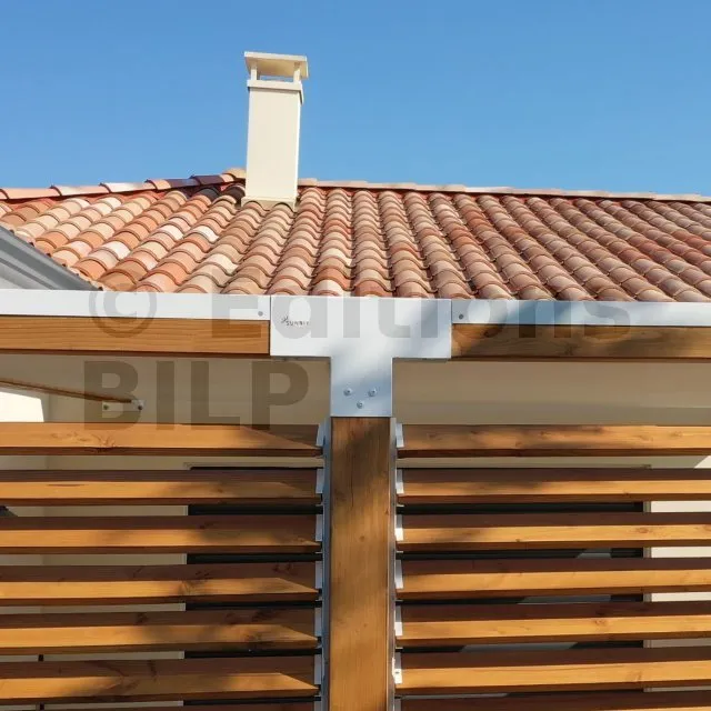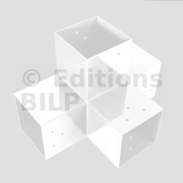 Il permet de raccorder une poutre de 90x90mm perpendiculairement à un chevron de 90x90mm, le tout étant supporté par un poteau vertical de 90x90mm.