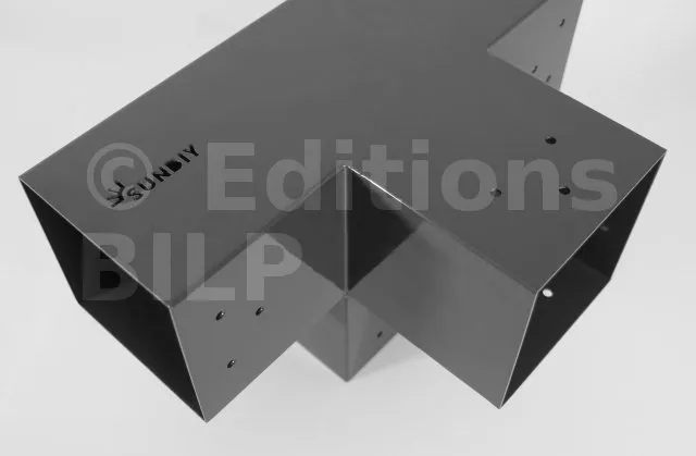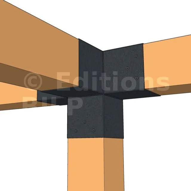 Il permet de raccorder une poutre de 120x120mm perpendiculairement à un chevron de 120x120mm, le tout étant supporté par un poteau vertical de 120x120mm.