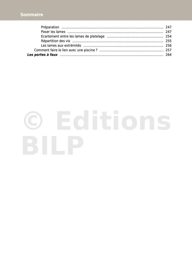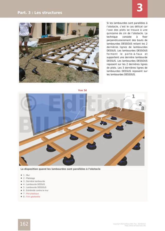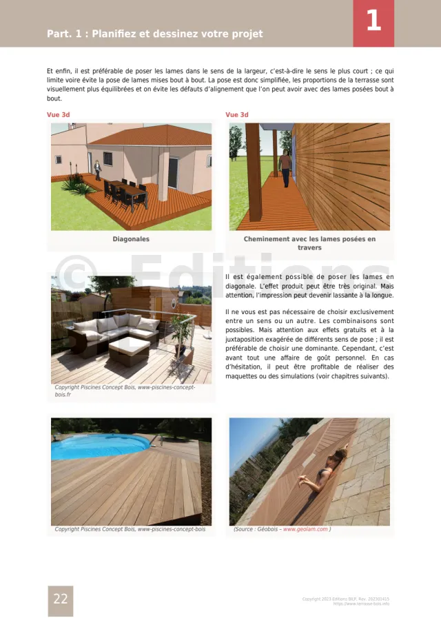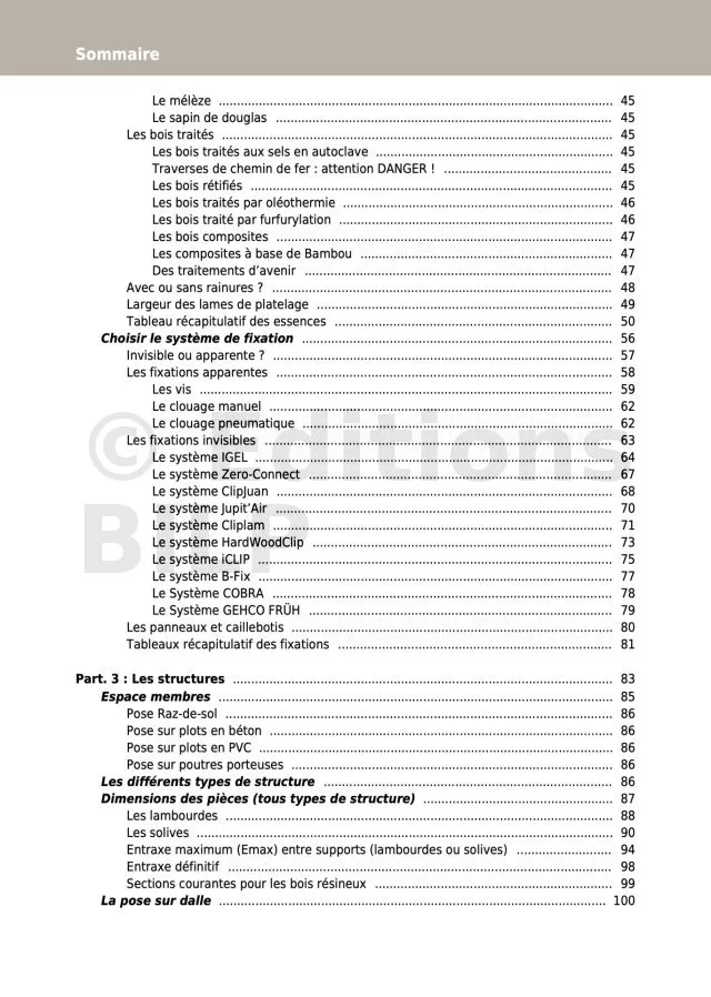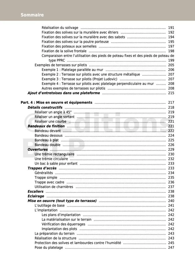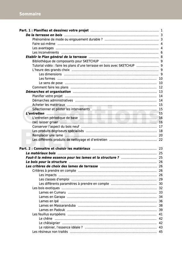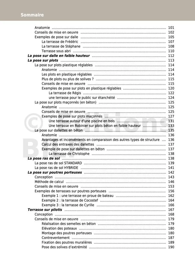Toutes les techniques de pose et de matériels sont proposés et expliqués avec photo à l’appui. L’accés au base de calcul pour la pose plot et lambourde est très faciles et aide beaucoup pour la construction.