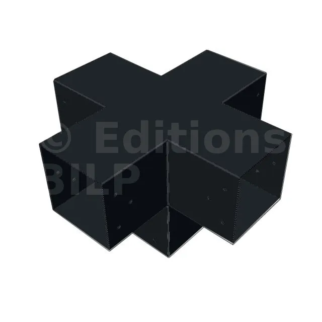 Il permet de raccorder deux poutres 120x120mm perpendiculairement à une autre poutre 120x120mm, le tout étant supporté par un poteau vertical de 120x120mm.