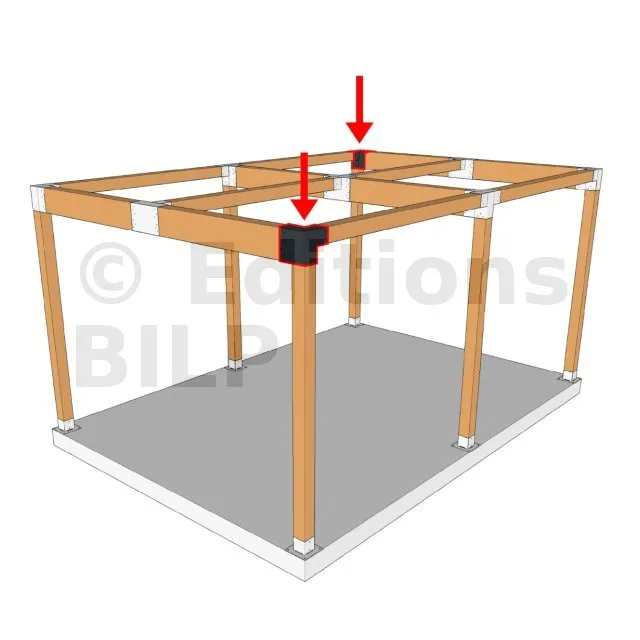 Il est utilisé dans un angle extérieur. Ce connecteur va permettre de raccorder une grosse poutre 240x120mm perpendiculairement à une poutre 120x120mm, le tout étant supporté par un poteau vertical 120x120mm.