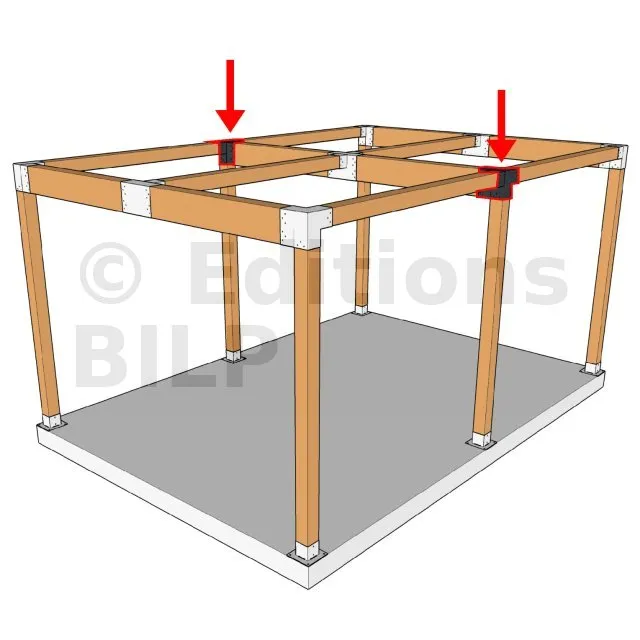 Il permet de raccorder deux poutres 120x120mm perpendiculairement à une grosse poutre 240x120mm, le tout étant supporté par un poteau vertical 120x120mm.