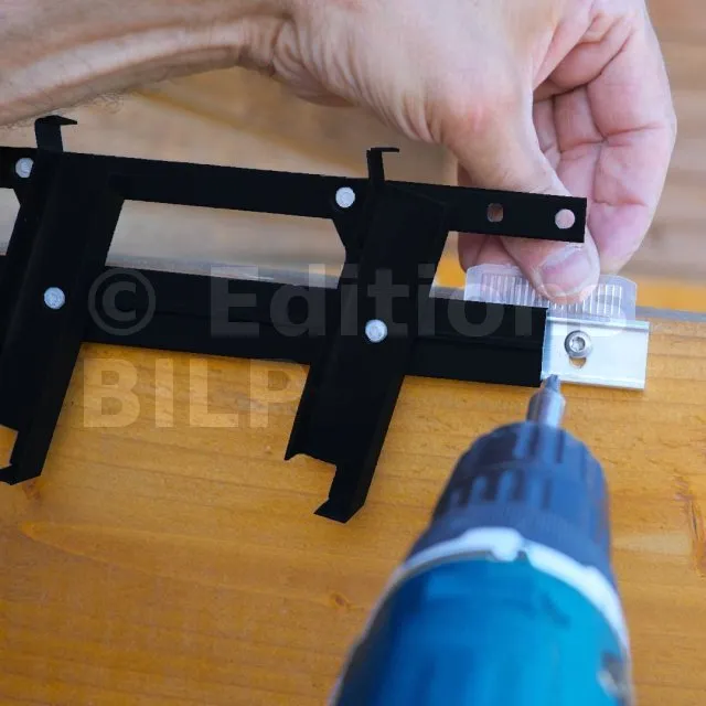 Fixation invisible : Les mécanismes sont assemblés entre eux par un embout spécial, lui même fixé sur le support (poutre de la pergola par exemple). La fixation doit être de diamètre 5mm, en INOX. Sa longueur et sa nature dépendent du support :
