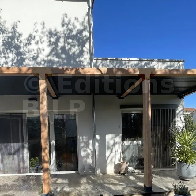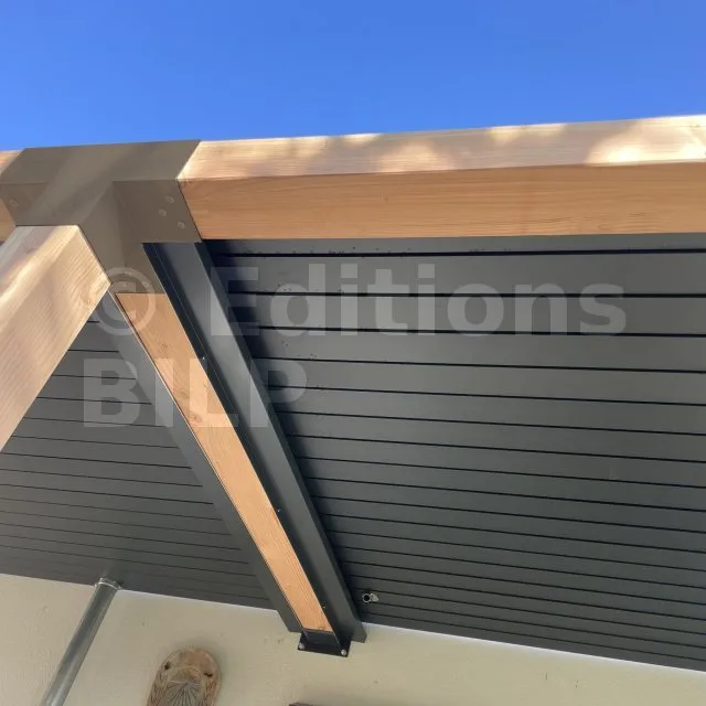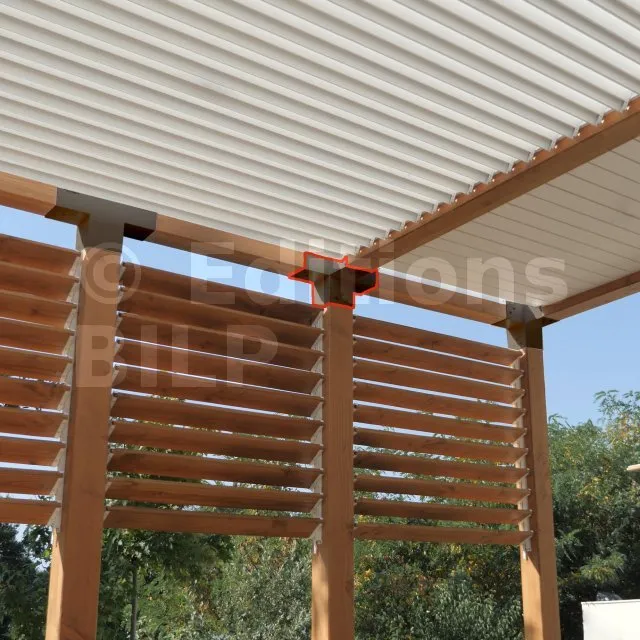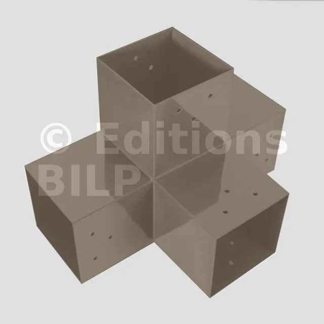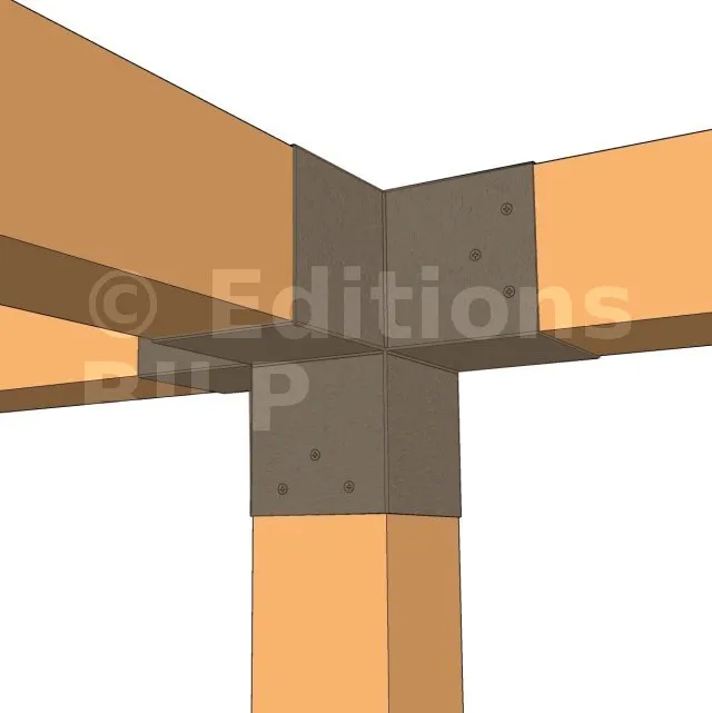 Il permet de raccorder une poutre de 120x120mm perpendiculairement à un chevron de 120x120mm, le tout étant supporté par un poteau vertical de 120x120mm.