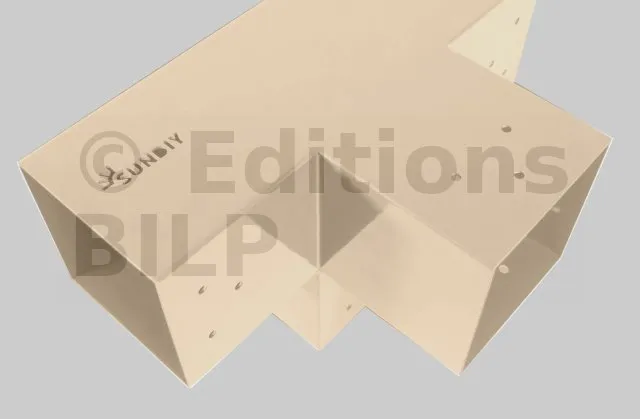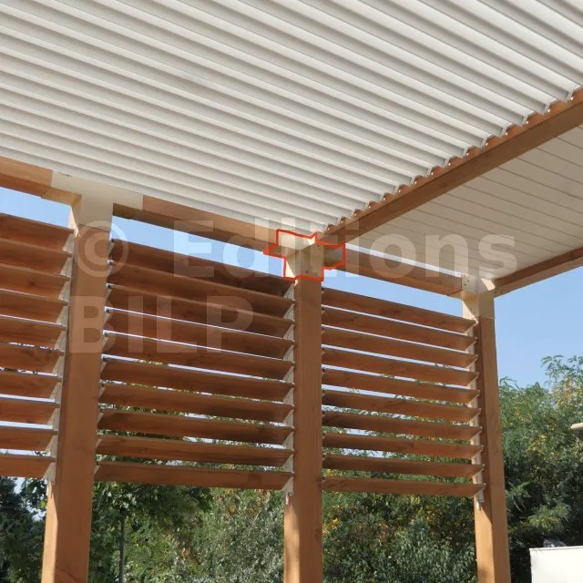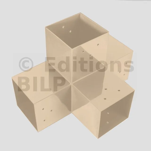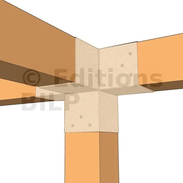Il permet de raccorder une poutre de 120x120mm perpendiculairement à un chevron de 120x120mm, le tout étant supporté par un poteau vertical de 120x120mm.