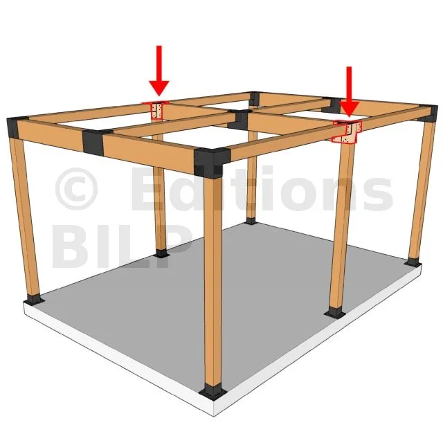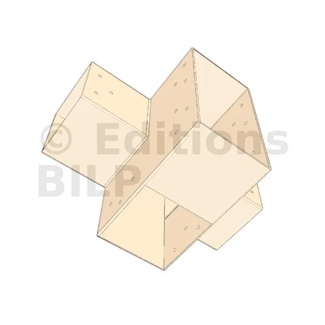Il permet de raccorder deux poutres 120x120mm perpendiculairement à une grosse poutre 240x120mm, le tout étant supporté par un poteau vertical 120x120mm.