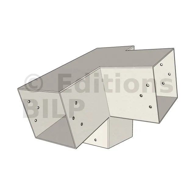 Il est utilisé dans un angle extérieur. Ce connecteur va permettre de raccorder une poutre 120x120mm à une poutre 120x120mm avec une pente de 20°, le tout étant supporté par un poteau vertical 120x120mm.