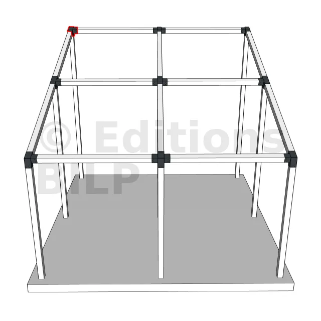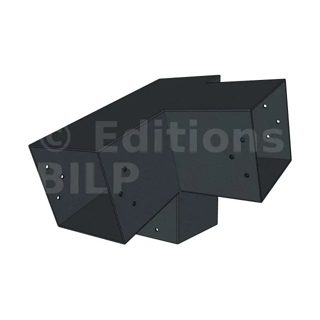 Il est utilisé dans un angle extérieur. Ce connecteur va permettre de raccorder une poutre 120x120mm à une poutre 120x120mm avec une pente de 20°, le tout étant supporté par un poteau vertical 120x120mm.