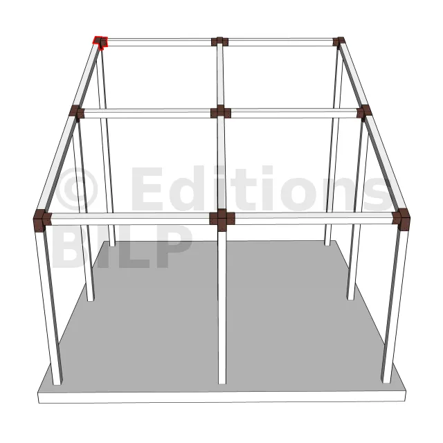 Il est utilisé dans un angle extérieur. Ce connecteur va permettre de raccorder une poutre 120x120mm à une poutre 120x120mm avec une pente de 20°, le tout étant supporté par un poteau vertical 120x120mm.