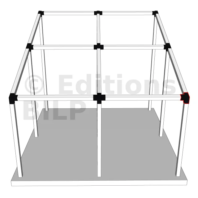 Il est utilisé dans un angle extérieur. Ce connecteur va permettre de raccorder une poutre 120x120mm à une poutre 120x120mm avec une pente de 20°, le tout étant supporté par un poteau vertical 120x120mm.