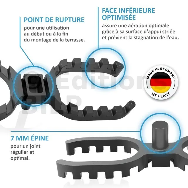En cas de doute, choisissez les cales de 4 mm : si les lames gonflent jusqu’à se toucher, cela peut provoquer des déformations du bois et endommager la terrasse.