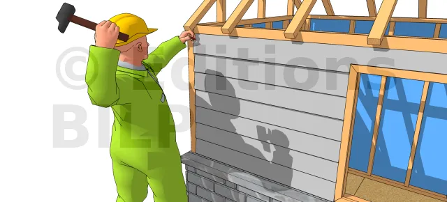Sauf par le fait du hasard ou bien que vous avez bien calculé d’avance, la partie supérieure de la dernière rangée du parement doit être ajustée. Avec une scie circulaire et un guide règle, coupez le haut de la bande de sorte que les plans de coupe butent bien contre la frise. Clouer les planches coupées en place.