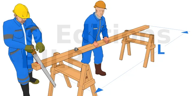 Cette première étape doit être un réflexe pour toute personne travaillant le bois. On prend l’équerre sur un côté de la poutre et on la coupe avec une scie circulaire ou une égoïne. Si, après vérification de la panne achetée, l’extrémité est déjà bien à l’équerre, cette étape peut être sautée.