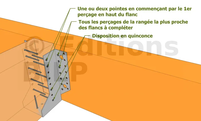 Le clouage partiel diminue le nombre de pointes à utiliser, facilite la mise en œuvre et fait gagner du temps mais ne permet pas d’obtenir la pleine capacité du sabot (diminution des charges). Cependant, sa mise en oeuvre doit être effectuée comme la description sur l’image.