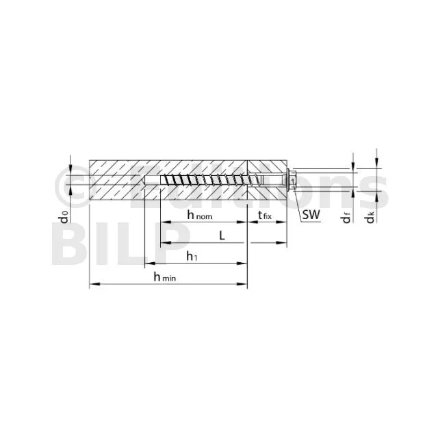 - Vis à insérer sans cheville dans un trou pré-percé. Le diamètre du foret pour le pré-perçage est indiqué dans la caractéristique "Diamètre nominal du foret, d0".