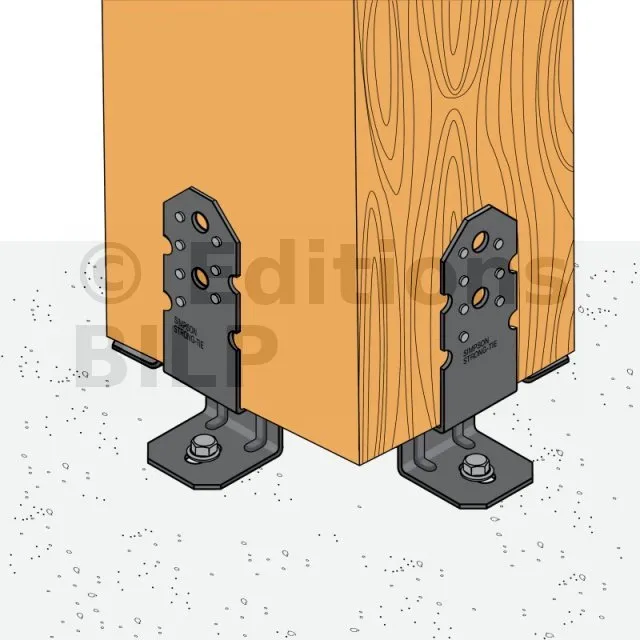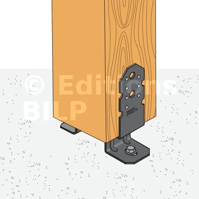 * Référez-vous à la gamme d’ancrage Simpson Strong-Tie pour sélectionner l’ancrage adapté. Les solutions standards sont BOAXII, SET-XP, WA, AT-HP, à choisir en fonction du type de béton, de l’entraxe et des distances aux bords.