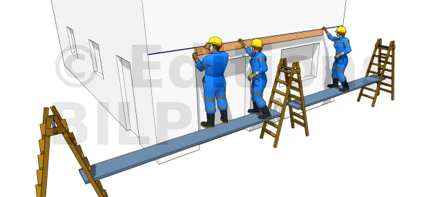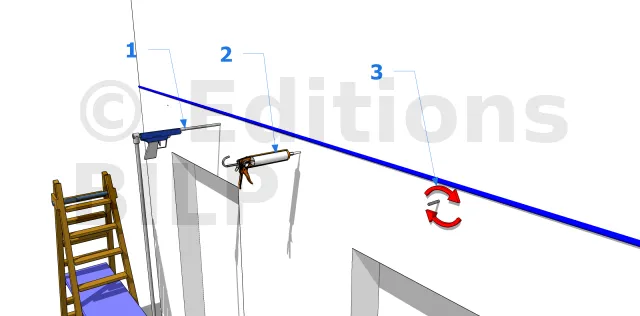 Simuler les alignements des 2 trous (panne et mur) en plaçant la panne sur le mur. Regarder au travers de la panne si vous voyez les trous du mur. Sinon, repérer encore une fois les trous avec la perceuse.
