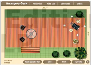 Une autre application, Arrange-a-deck, permet de simuler l’aménagement d’une terrasse. Ce logiciel affiche une vue d’en haut et permet de disposer des éléments d’aménagements prédéfinis, mobilier, accessoires, etc. C’est une bonne application pour commencer à se faire une idée d’un projet à ses débuts, mais il ne faut pas lui en demander plus.