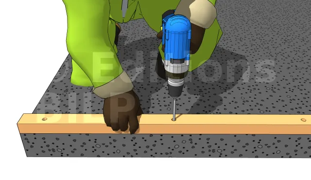 La traverse va nous servir de guide de perçage. Elle doit donc être percée au préalable. Positionnez-la à sa position finale. Percez la dalle en béton en passant la mèche au travers des orifices existants. Le diamètre de la mèche béton correspond à celui de la tige filetée + 2 mm au maximum. Ex : pour une tige filetée D14, percer à D16.