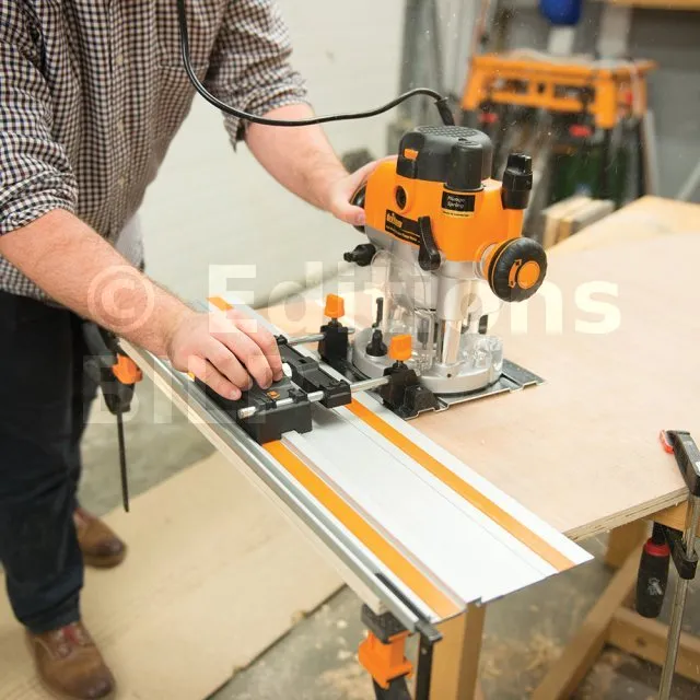 - Permet d’attacher des rails de guidage à la défonceuse en toute simplicité pour une meilleure stabilité et précision pour effectuer des lignes droites.