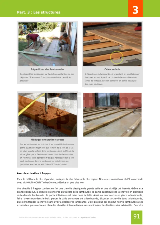 Les calculs sur le écartements, les portées de lambourdes et toutes les photos qui permettent de voir comment faire telle ou telle chose.