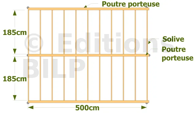 Avec la configuration "1 quadrilatère", je dois avoir des solives d’environ 400cm de portée. La calculatrice de section m’indique une section de 200mmx100mm. J’ai beau chercher mais je ne trouve pas de telles solives près de chez moi. Je décide alors d’ajouter une ligne de poutre porteuse intermédiaire ce qui ramène la portée des solives à 185cm. La calculatrice m’indique alors une section de 185x50. Mon marchand de bois me propose du 150x40 en 2m de long. Je vérifie avec la 2ème calculatrice et je trouve une portée max. de 192cm. C’est OK
