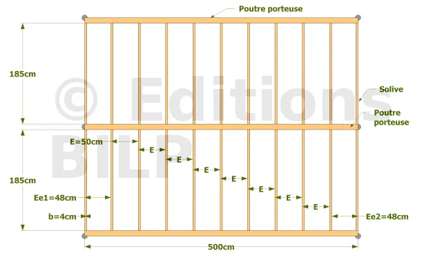 en tenant compte des dimensions souhaitées de la plateforme. Répartissez les solives selon l’entraxe E. Aux extrémités des solives, dessinez les poutres porteuses. La distance entre les poutres porteuses correspond à la portée Ps.