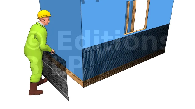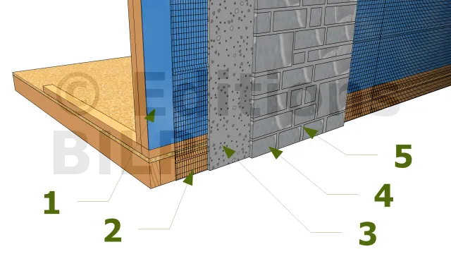 - 1 : Papier isolant ; 2 : Lattis ; 3 : Mortier ; 4 : Faux pierre ; 5 : joint