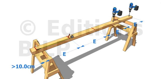 - 1. Repérer les trous de fixation de la panne selon un entraxe E : commencer par prendre les mesures aux deux extrémités, les distances aux extrémités sont au minimum de 10 cm pour éviter l’éclatement du bois, il en est de même pour le mur. Calculer ensuite les distances des perçages intermédiaires en divisant la longueur disponible par l’entraxe prédéfini de ces trous. Pour connaitre cet entraxe, voir Choix de la section et de la quantité des tiges filetées (cas d’une muralière).