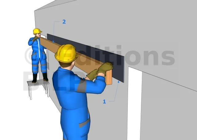 Interposer une bande bitumineuse épaisse entre la muralière et le mur. Laisser dépasser la bande vers le haut sur une largeur équivalente à l’épaisseur de la panne + 3 cm. Aucune partie de la panne ne doit être en contact avec le mur, la largeur totale de la bande est donc égale à la largeur de la panne + épaisseur de la panne + 3 cm.