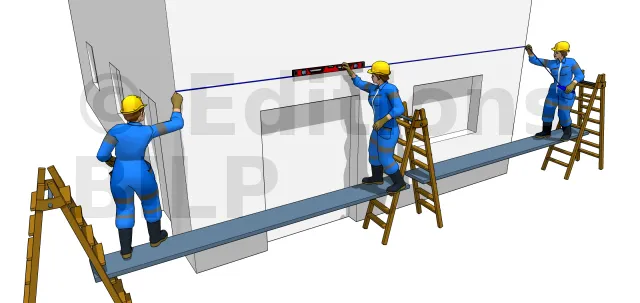 Prendre le niveau de la face supérieure de la poutre. Ainsi, vous aurez toujours le repère en vue durant la fixation. Tracer à l’aide d’un cordeau à tracer. Attention, cette ligne doit être bien horizontale. Voir aussi : Niveau sur grande distance.