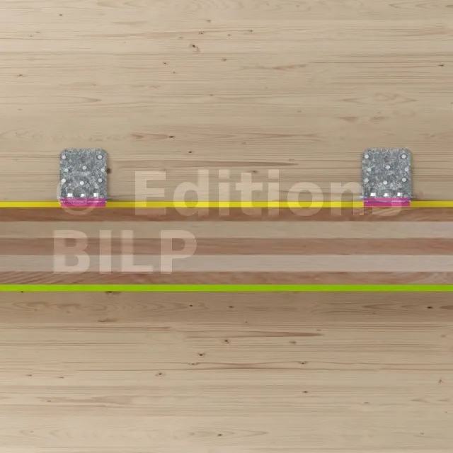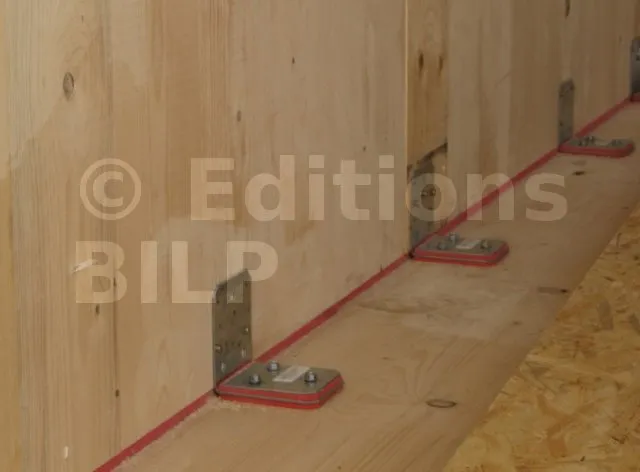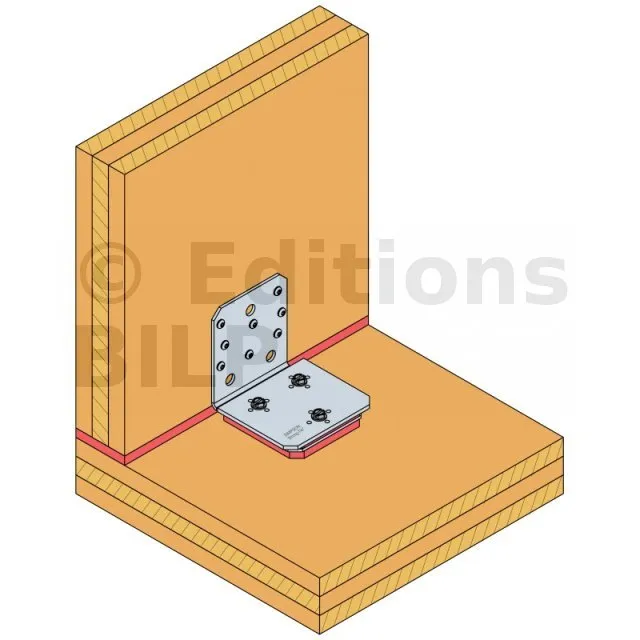 Pour une efficacité totale, la présence d’une bande Sylodyn® sous les panneaux murs CLT est impérative. Le choix des bandes Sylodyn® dépend du poids du mur (voir tableau ci-dessous). Un gabarit de montage (réf. MOABAI) est disponible pour une meilleure pose de l’équerre ABAI. Il évite en effet la compression de la bande de Sylodyn® présente sous l’équerre.