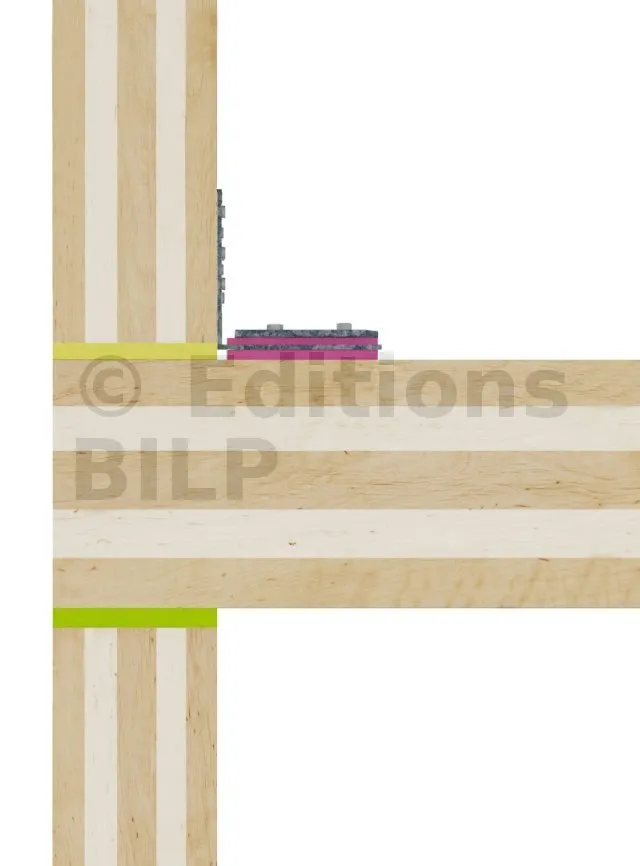 L’équerre acoustique ABAI est une équerre innovante car elle associe une équerre classique à un matériau d’isolation acoustique, la Sylodyn®. Elle permet la connexion entre éléments de mur et de plancher en panneaux multiplis (CLT), tout en garantissant une isolation phonique entre ces composants grâce à une bande de Sylodyn® de 12 mm préinstallée sous l’équerre.