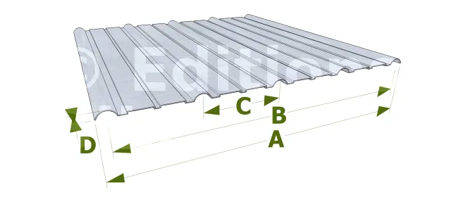 Le largeur standard des tôles galvanisées est souvent soit de 81 cm soit de 96,52 cm ( Comme on le montre dans cette figure). Pour ce dernier, il couvre une surface de 92 cm lors de la pose étant donné que les extrémités latérales doivent se chevaucher. Les ondulations de 1,91 cm sont rencontrées à intervalles de 22,86 cm. Pour la longueur, on a une dimension standard de 2,40 m mais on peut toujours commander n’importe quelle longueur.