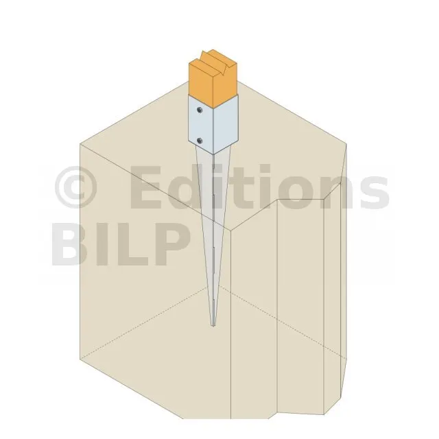 Installation Partie basse : 1. Positionner le pied de poteau dans la structure. 2. Insérer une cale martyre dans le pied de poteau (chute de pied de poteau ou cale plastique). 3. Enfoncer le pied de poteau dans le sol en frappant bien verticalement avec une masse.