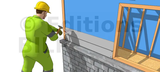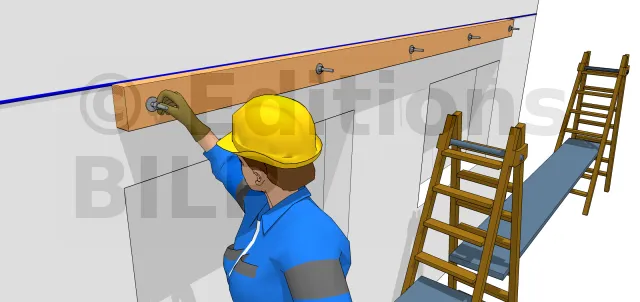 Placez le second parement en prenant comme référence la première rangée. Comme pour la première rangée, toujours clouer contre le mur au niveau de l’emplacement des poteaux. Tracez des lignes de craie de niveau sur le mur pour marquer les lignes de référence tout en s’assurant que pour chaque rangée, les parements se superposent entre eux de 3 cm.