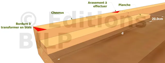 Pour éviter la difficulté d’alignement de deux pièces de grande dimension, on va travailler une simple planche de même largeur que les chevrons. Si vous n’en avez pas à la bonne taille, découper une planche bien plane suivant sa longueur. La longueur de cette planche doit dépasser d’une vingtaine de centimètres la distance entre le bord du chevron et l’arase à créer. Une extrémité de l’élément doit être bien droite ; si ce n’est pas le cas, tracer une ligne perpendiculaire avec une équerre de maçon et découper avec une scie égoïne ou circulaire. Attention, il y a donc deux patrons pour les deux extrémités d’un chevron et ils ne sont pas identiques.