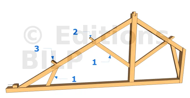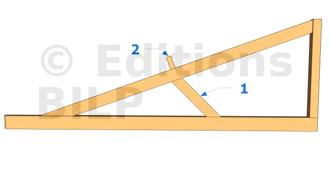 Dans le cas d’une ferme tronquée avec un arbalétrier de très grande longueur qui supporte deux pannes intermédiaires, la contrefiche va être positionnée à l’une de ses extrémités sur l’entrait et à l’autre extrémité au-dessous de l’arbalétrier, au niveau de la deuxième panne intermédiaire.