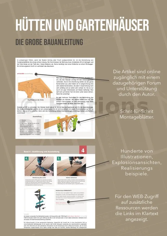 Des informations concrètes pour votre projet. Tous les secrets, tous les trucs et les astuces pour réussir votre cabane, abri, garage ou extension. Toutes les techniques, tous les produits vous sont décrits de façon objective et indépendante. Des vues détaillées vous décrivent toutes les étapes de la construction.