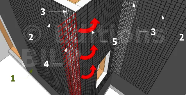 - 4 : Doublure en maçonnerie avec lame d’air d’au moins 2,5 cm d’épaisseur