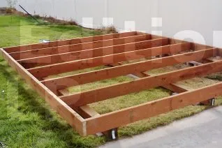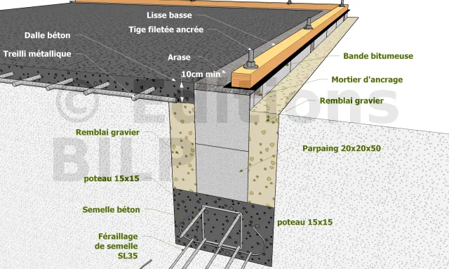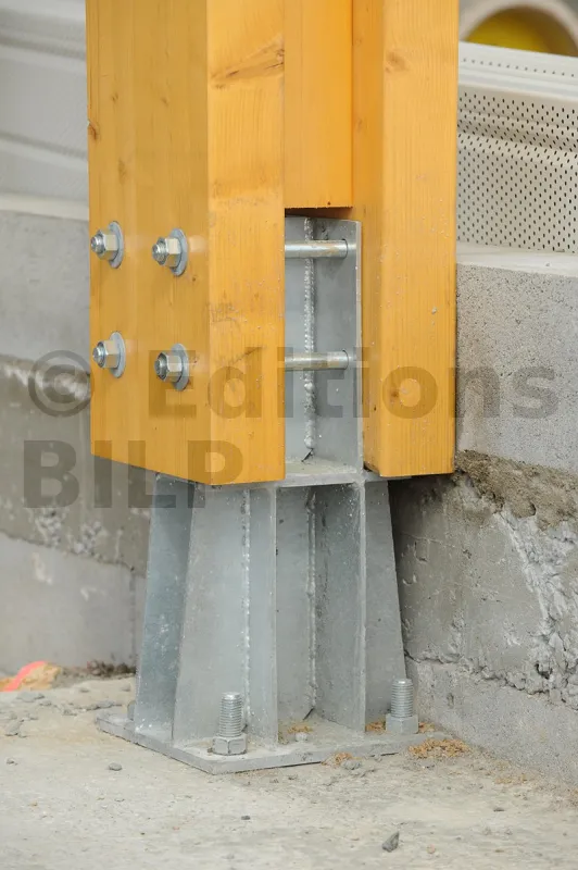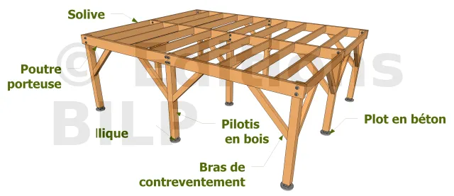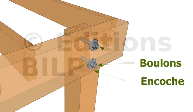 Une encoche est pratiquée dans le pilotis. Elle supporte la poutre porteuse. Il faut au moins que la moitié de la largeur de la poutre repose sur le pilotis. La poutre est maintenue au pilotis avec deux boulons.