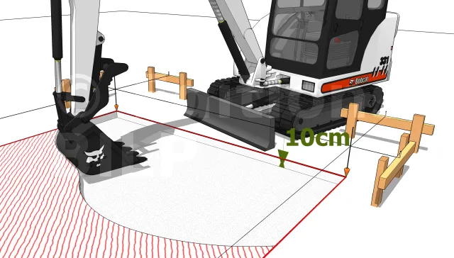 L’excavation correspond à la surface de la construction. Mais on peut aussi un peu déborder pour aménager un espace sain et sec autour de l’ouvrage.