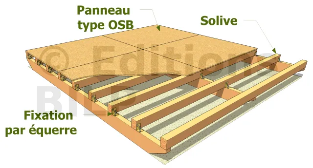 Si vous prévoyez de tracter la cabane pour la déplacer, il est important de fixer les solives aux patins très solidement. On utilise des équerres de bonnes dimensions en épaisseur 2,5 mm.