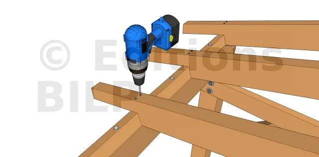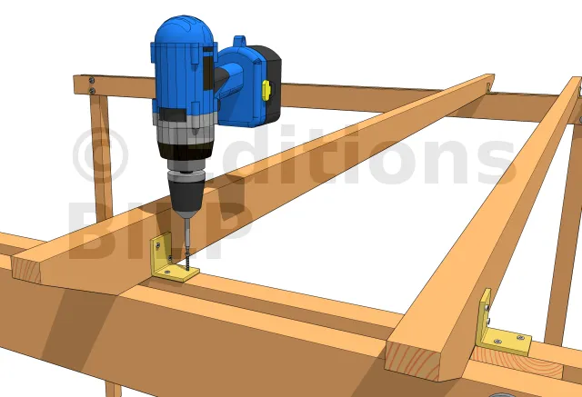 On insère 2 vis à 45° sur les 2 faces de chaque chevron de façon à traverser le chevron et à le visser dans la panne. La longueur des vis doit donc être suffisante. C’est une technique permettant une certaine économie et qui fonctionne avec des chevrons de toutes les hauteurs mais n’est pas plus fiable que la technique précédente.