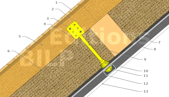 Elle est composée d’une tige, d’une clé et d’une rondelle. Elle se fixe comme les suspentes classiques. Les encoches serviront de repère pour leur fixation sur les chevrons. La tige à pour fonction d’embrocher la laine minérale sous le chevron tandis que la rondelle la maintiendra. Par la suite, la membrane d’étanchéité à l’air devra y être également embrocher avant d’être verrouiller par la clé où l’on éclipsera la fourrure. Pour finir, il suffira d’y fixer les plaques de plâtre.