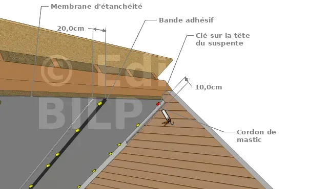 Pour le fixer définitivement, vous devrez clipser au fur et à mesure les clés sur les têtes des suspentes. Entre deux membranes discontinues, un recouvrement de 10 cm est nécessaire.