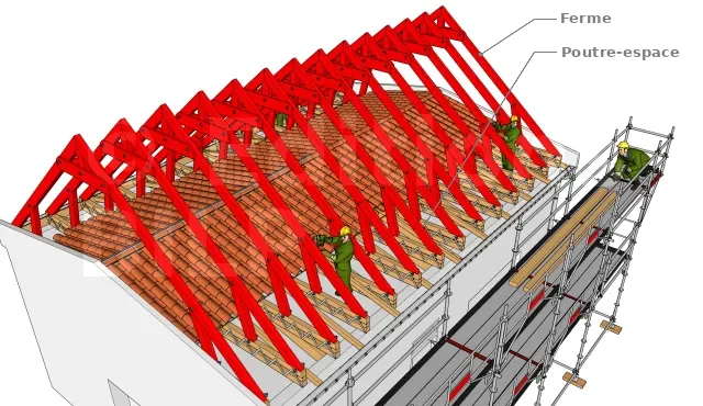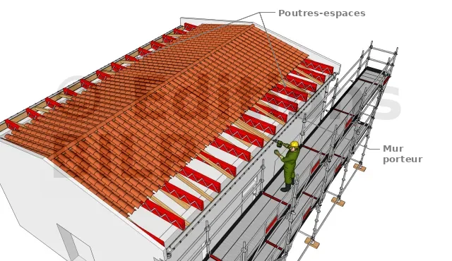 Puis, vous allez glisser les poutres-espaces dans le vide créé par l’enlèvement des tuiles. Il est important qu’ils prennent correctement appui sur les murs porteurs car ils ont un rôle structurel. En effet, ces poutres permettront de créer le futur plancher porteur de l’étage mais également de reprendre une partie des charges venant de la couverture.