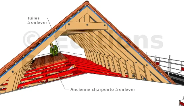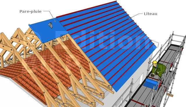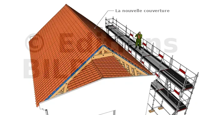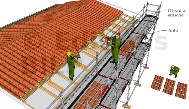 Vous devrez retirer et mettre de côté les tuiles de la toiture existante du bas du rampant sur quelques rangs en fonction de votre toiture. Ces derniers pourront encore servir si vous le souhaitez pour la couverture de la nouvelle toiture. Si la pente de votre toiture est assez faible, il vous faudra également enlever les liteaux en les découpant.