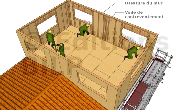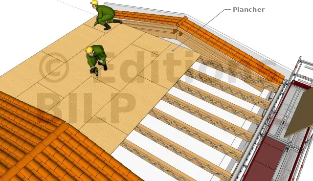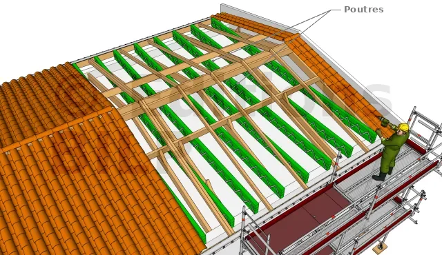 Pour leur mise en œuvre, ils sont à placer parallèlement à chaque entrait bas de la charpente, tous les 60 cm sur le bas du rampant de la couverture. De ce fait, ils auront un rôle de solivage en attendant la mise en place du nouveau plancher.